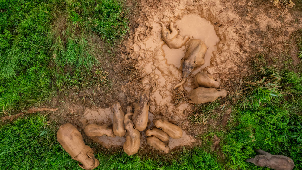2024年8月8日,“短鼻家族”和“然然家族”的野象在云南省西雙版納州景洪市大渡崗鄉的泥塘里玩耍(無人機照片)。近年來,云南修復改造了一些大象棲息地,種植大象愛吃的植物,同時運用紅外相機等技術手段,實現亞洲象位置信息的實時發布。