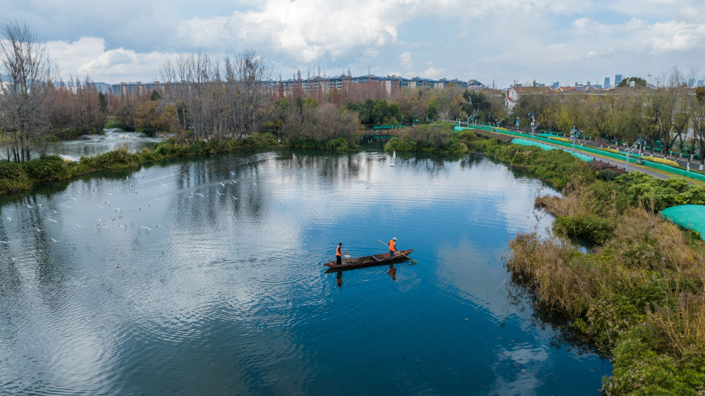 2024年1月16日,管護人員在滇池打撈雜物(無人機照片)。據昆明市滇池管理局介紹,2023年滇池全湖水質持續向好,自2018年上升為Ⅳ類水質后,連續六年保持全湖水質Ⅳ類。