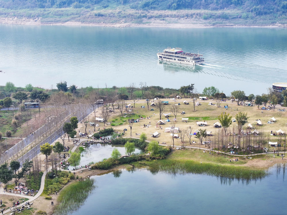 2024年3月16日,游客在重慶廣陽島東島頭一帶游覽、休閑(無人機照片)。廣陽島是長江上游最大的江心島。近年來,當地系統推進自然恢復、生態修復,豐富生物多樣性。2024年,重慶廣陽島生態修復項目成功入選聯合國“生態恢復十年”優秀案例。