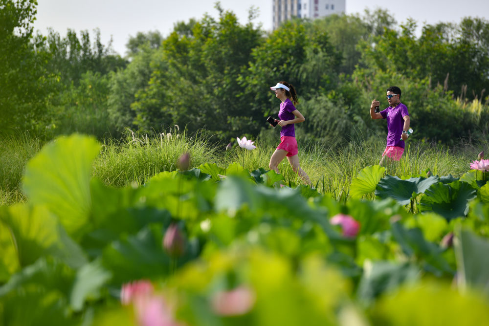 2024年6月23日,市民在陜西省漢中市天漢濕地公園內運動休閑。漢江是長江的最大支流,是南水北調中線工程的重要水源。近年來,漢中市加強對漢江源頭和沿岸濕地生態保護修復,構建人水和諧共生的美麗城市,確保“一泓清水永續北上”。
