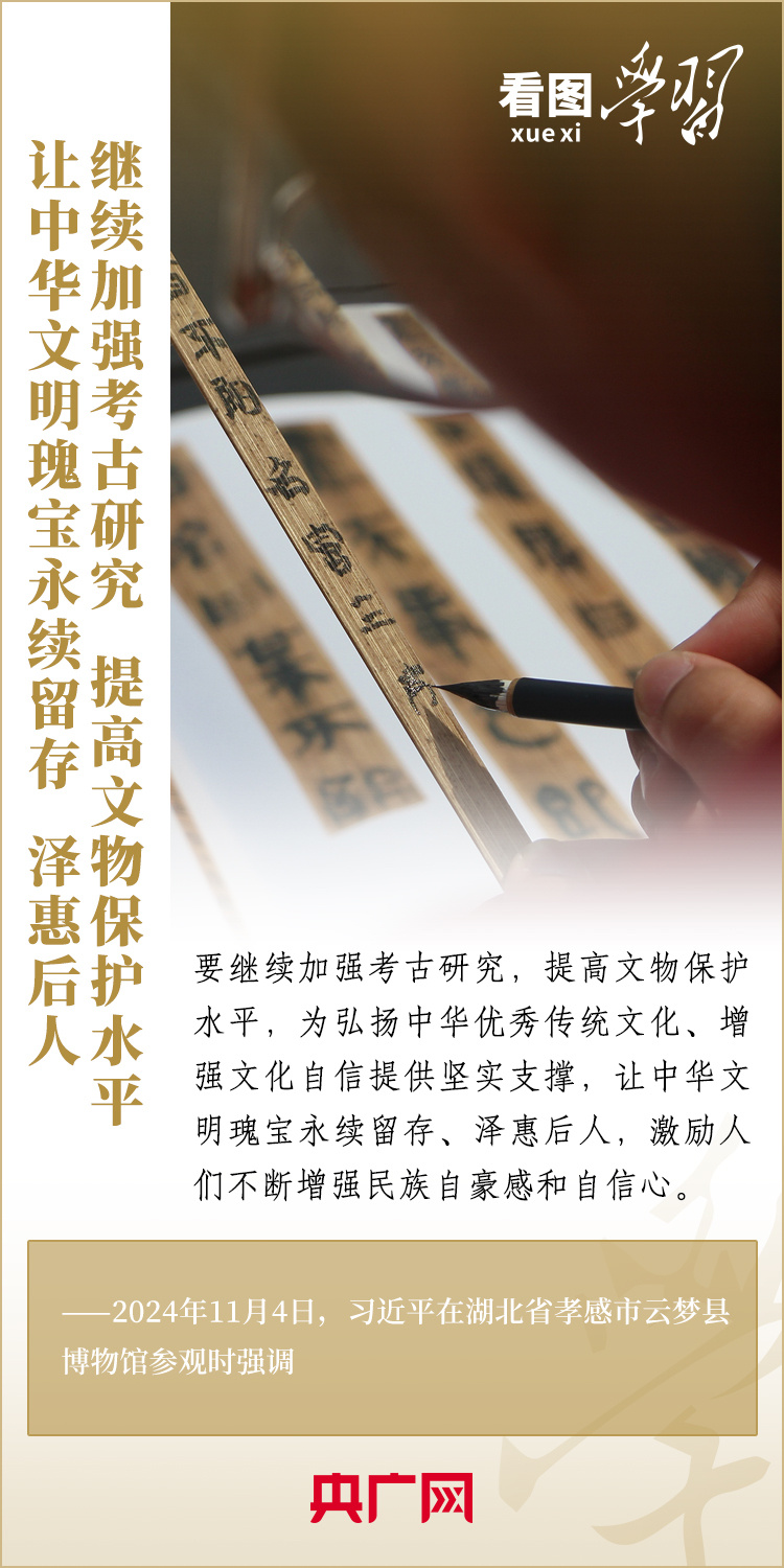 11月4日,習(xí)近平總書記在湖北省孝感市云夢縣博物館參觀出土秦漢簡牘展。這里收藏的我國考古史上首次發(fā)現(xiàn)的秦簡——云夢睡虎地秦簡,反映了戰(zhàn)國晚期到秦始皇時期的政治、經(jīng)濟(jì)、文化、法律、軍事等方面的情況。習(xí)總書記詳細(xì)聽取簡牘內(nèi)容、歷史文化價值和保護(hù)研究情況介紹,指出要繼續(xù)加強(qiáng)考古研究,提高文物保護(hù)水平,讓中華文明瑰寶永續(xù)留存、澤惠后人。