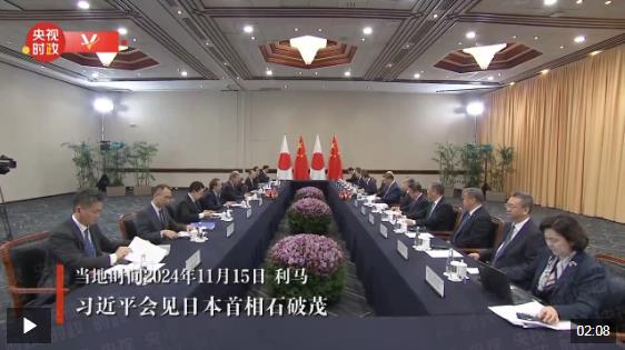當地時間11月15日,國家主席習近平在利馬出席亞太經合組織領導人非正式會議期間會見日本首相石破茂。