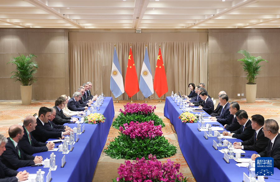 當地時間11月19日上午,國家主席習近平在里約熱內盧出席二十國集團領導人峰會期間會見阿根廷總統米萊。新華社記者 張領 攝