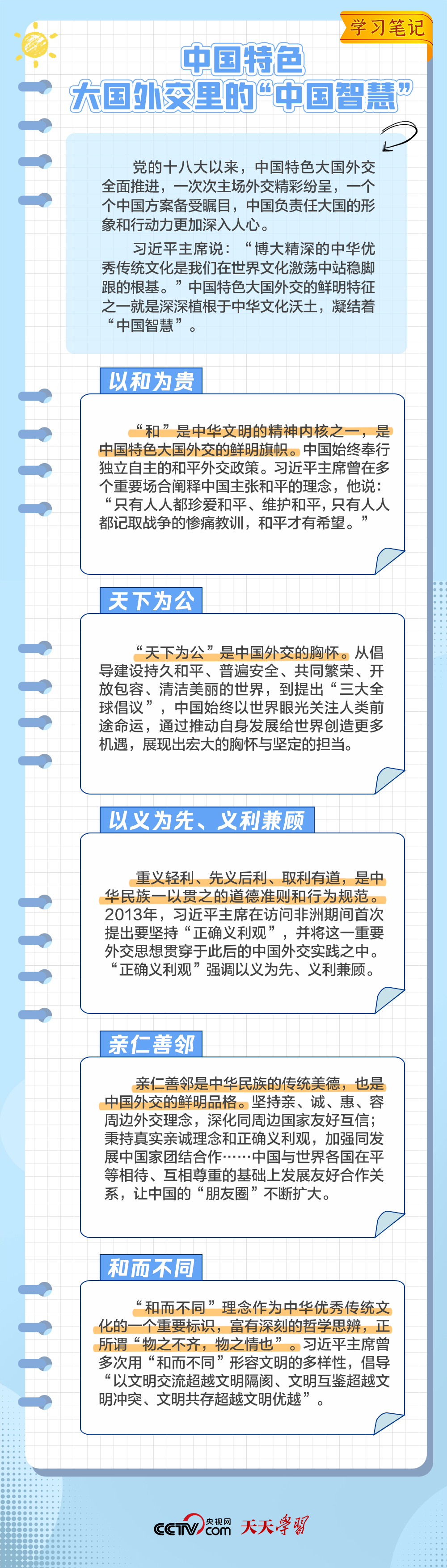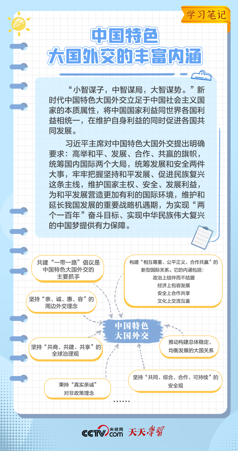 10年來,面對風云變幻的國際形勢,中國特色大國外交扎實推進,形成了全方位、多層次、立體化的外交布局,為我國高質量發展營造了良好外部環境。中國特色大國外交提出10周年之際,《學習筆記》特梳理其內涵要義,與您一同感悟其中蘊含的“中國智慧”。