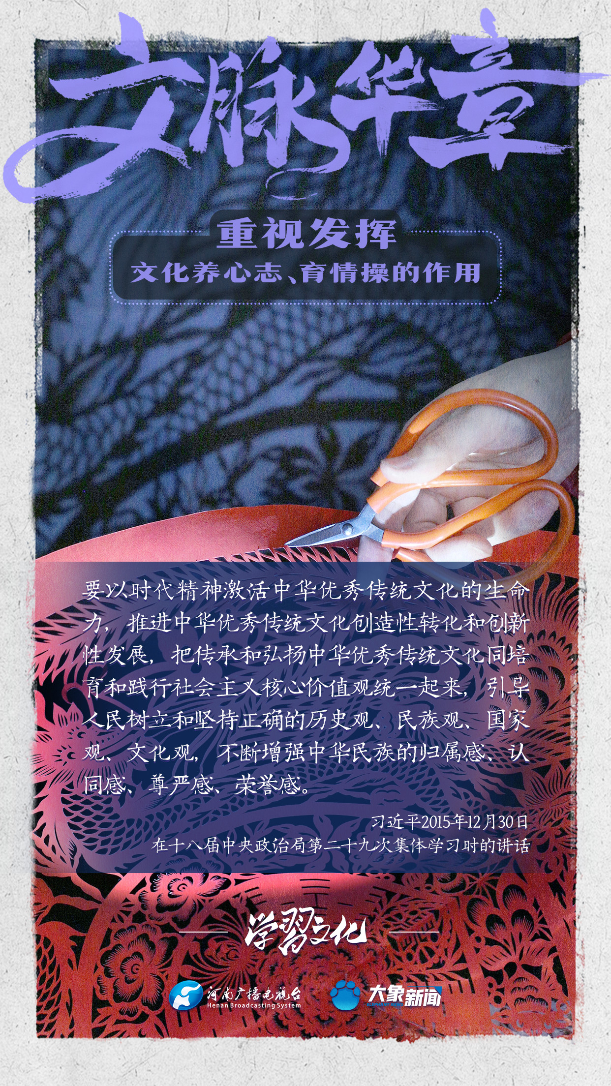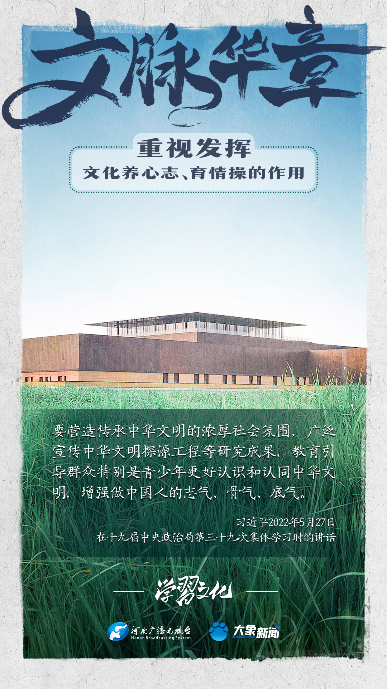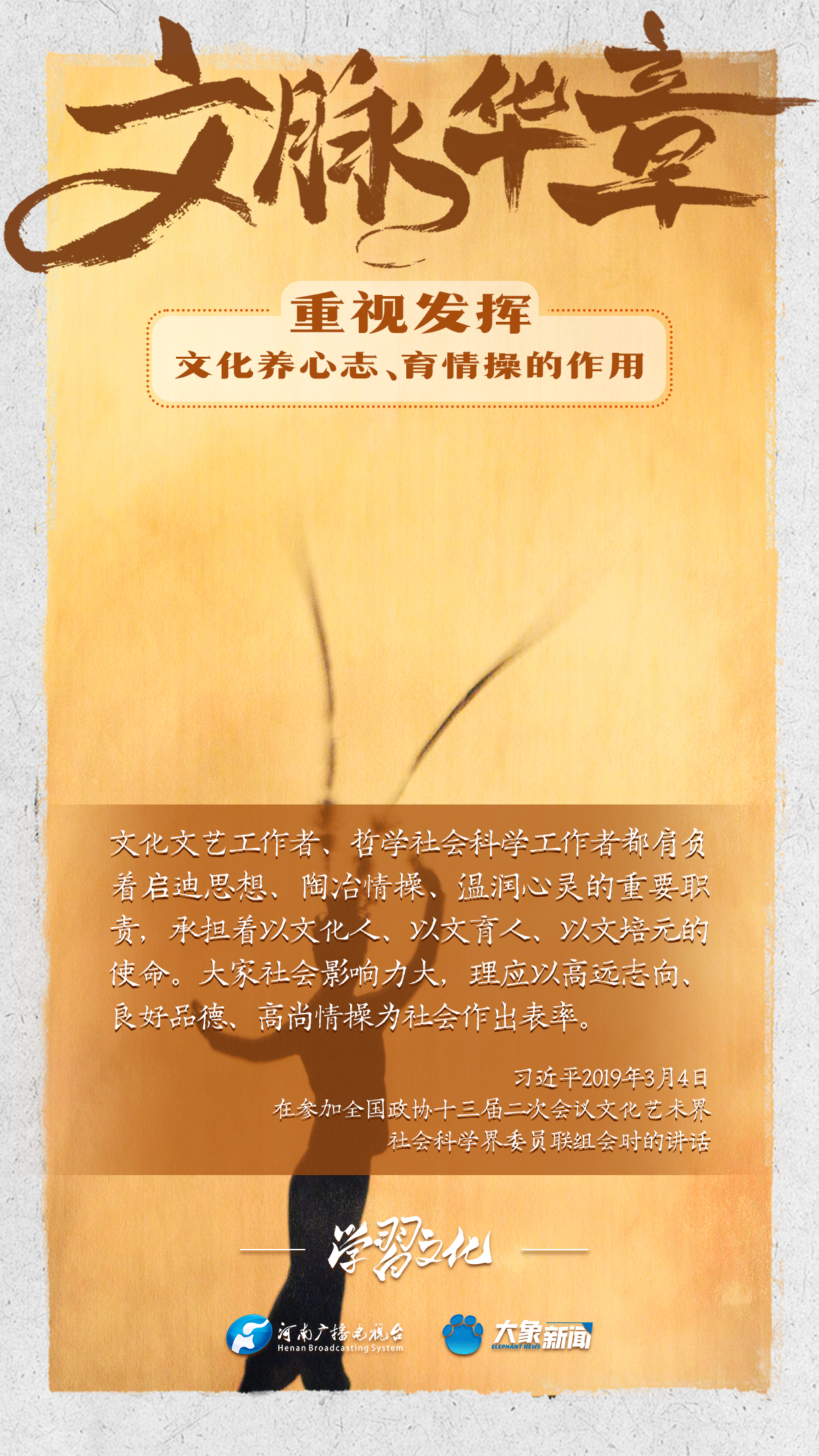 習近平總書記在主持中共中央政治局第十七次集體學習時強調,重視發揮文化養心志、育情操的作用,涵養全民族昂揚奮發的精神氣質。總書記高度重視文化的作用,發表了一系列重要講話,倡導以文載道、以文傳聲、以文化人。我們一起學習。