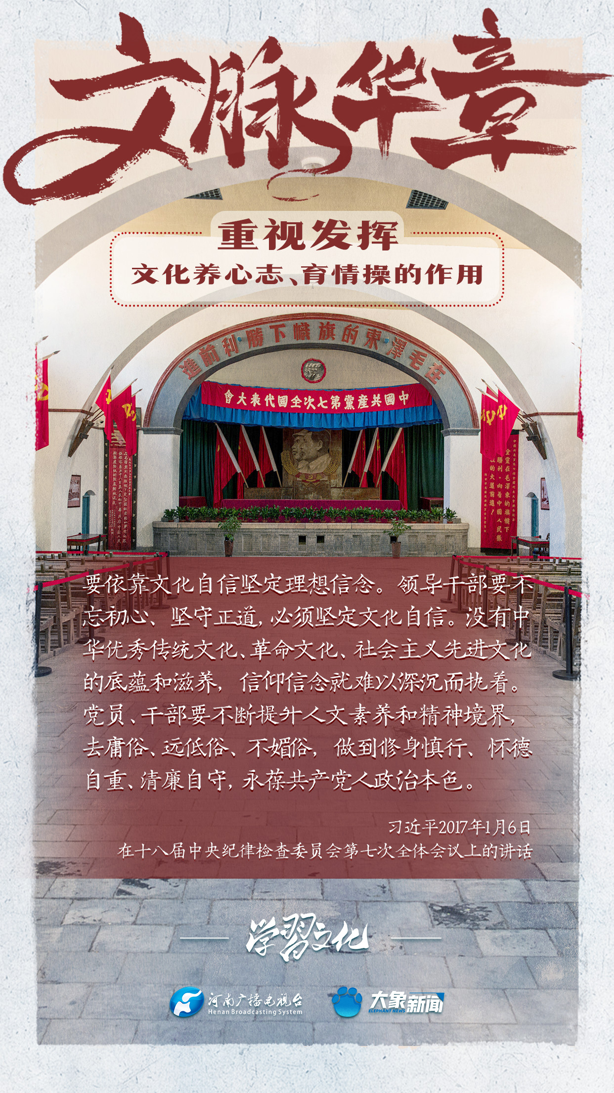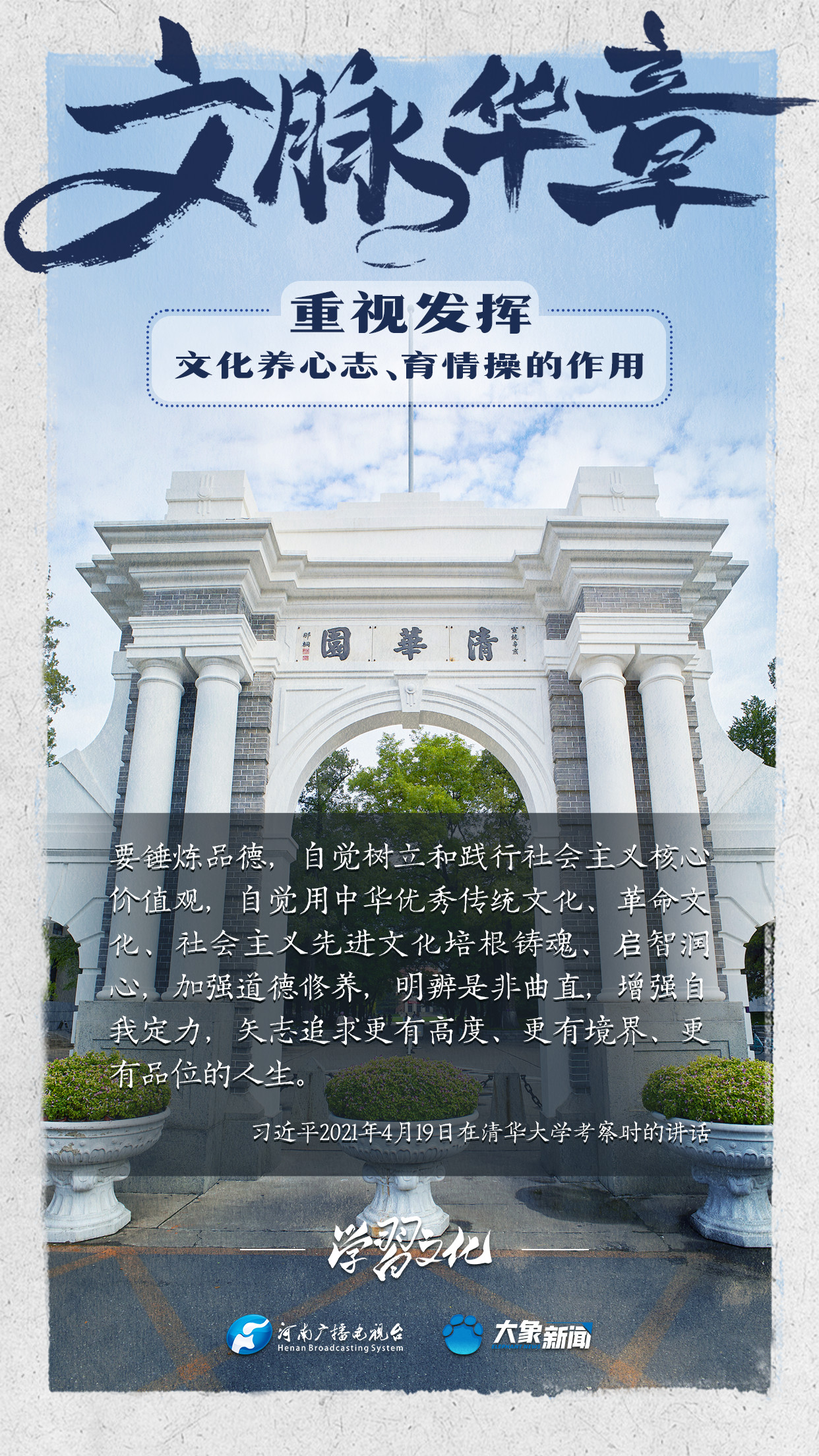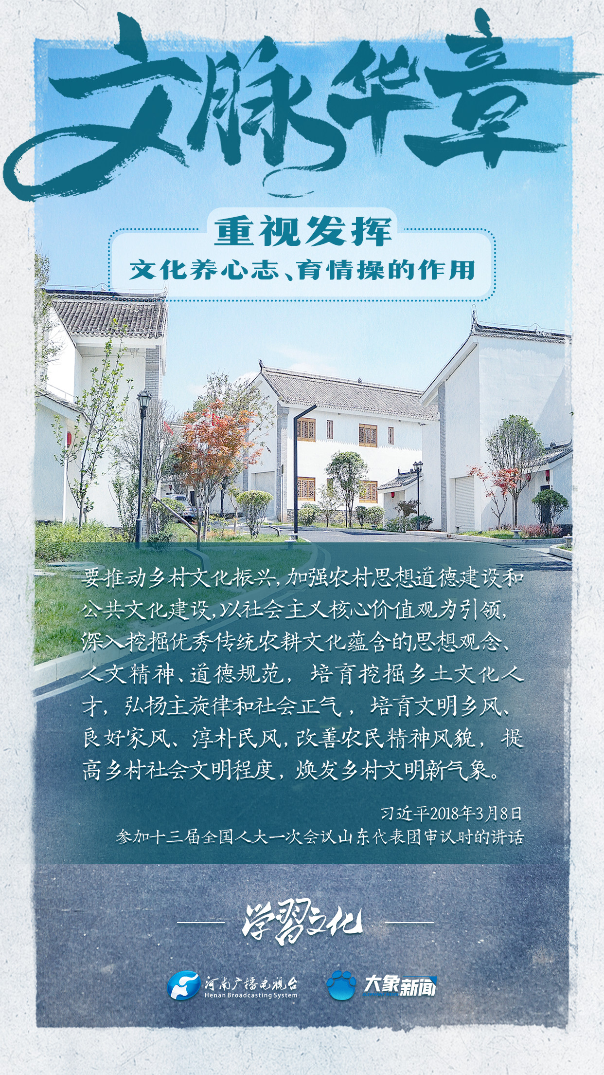 習近平總書記在主持中共中央政治局第十七次集體學習時強調,重視發揮文化養心志、育情操的作用,涵養全民族昂揚奮發的精神氣質。總書記高度重視文化的作用,發表了一系列重要講話,倡導以文載道、以文傳聲、以文化人。我們一起學習。