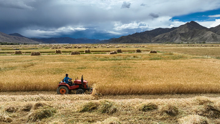 2024年9月10日在西藏日喀則市白朗縣巴扎鄉拍攝的秋收場景(無人機照片)。新華社記者 晉美多吉 攝