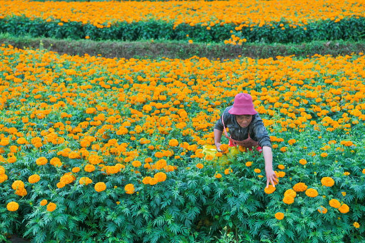 2024年7月30日,村民在貴州省威寧縣雙龍鎮高坡村采摘萬壽菊。新華社記者 楊文斌 攝