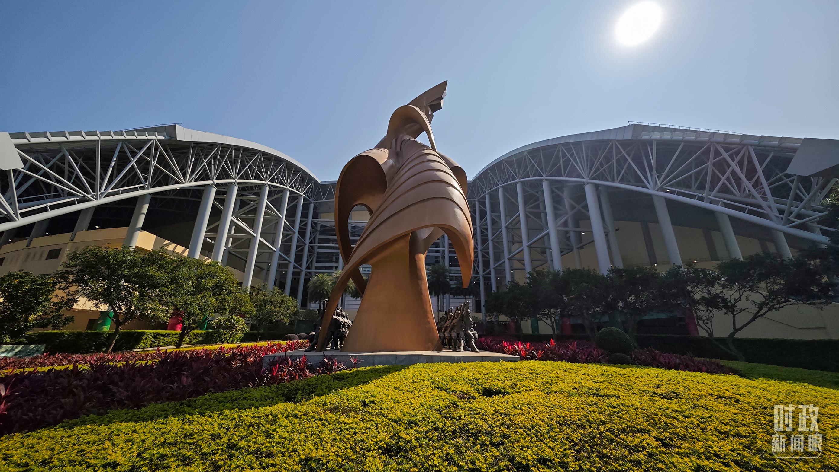 澳門東亞運動會體育館前,名為“揚帆”的巨型雕塑熠熠生輝。(總臺央視記者彭漢明拍攝)