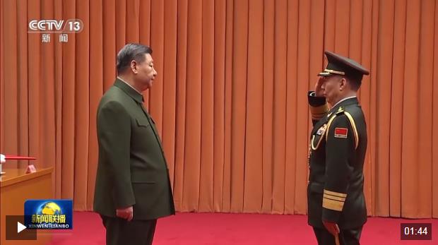 習近平向晉升上將軍銜的陸軍政治委員陳輝頒發命令狀,表示祝賀。佩戴了上將軍銜的陳輝向習近平敬禮,向參加儀式的全體同志敬禮,全場響起熱烈掌聲。