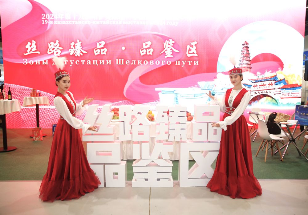 2024年8月23日,在哈薩克斯坦阿斯塔納,身著民族服飾的工作人員在第十九屆哈薩克斯坦—中國商品展覽會上歡迎觀展民眾。新華社發(fā)(奧斯帕諾夫攝)