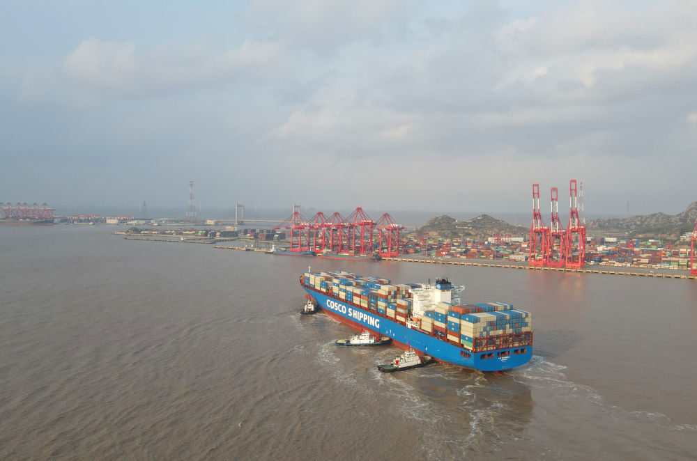 “新上海”輪抵達(dá)洋山港,這是自秘魯錢凱港開港后首個(gè)“錢凱—上海”正式航次(2024年12月18日攝,無人機(jī)照片)。新華社記者 方喆 攝