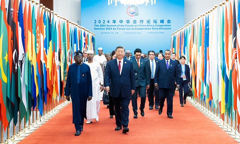 △2024年9月5日,習近平主席在北京人民大會堂出席中非合作論壇北京峰會開幕式并發表主旨講話。這是習主席同外方領導人共同步入會場。