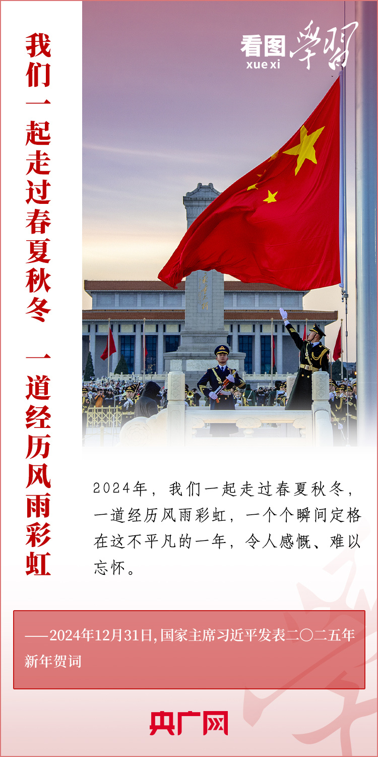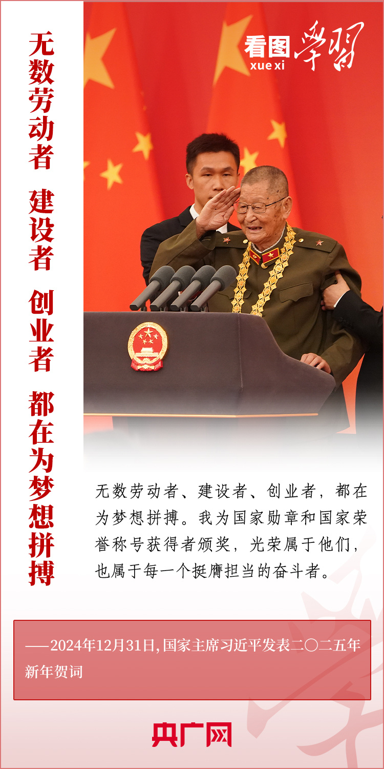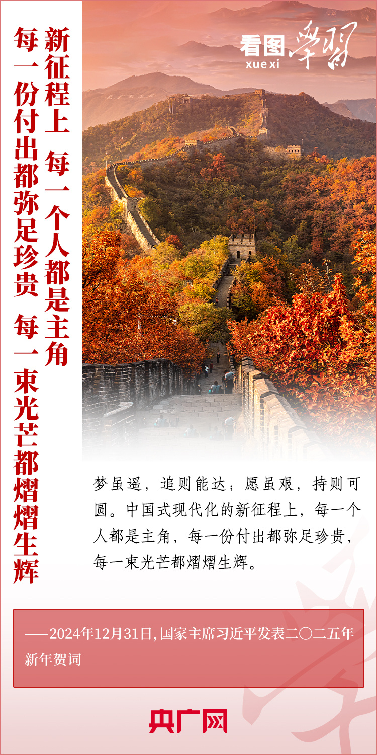 “夢雖遙,追則能達;愿雖艱,持則可圓。”新年前夕,習近平主席發表二〇二五年新年賀詞。在溫暖有力的講述中,習主席深情回望過去一年中國不平凡的奮斗歷程、精彩瞬間,感慨大家一道經歷的風雨彩虹、難忘時刻,贊美無數為夢想拼搏的勞動者、建設者、創業者。習主席說,中國式現代化的新征程上,每一個人都是主角,每一份付出都彌足珍貴,每一束光芒都熠熠生輝。讓我們充滿信心,在新的一年接續奮斗!