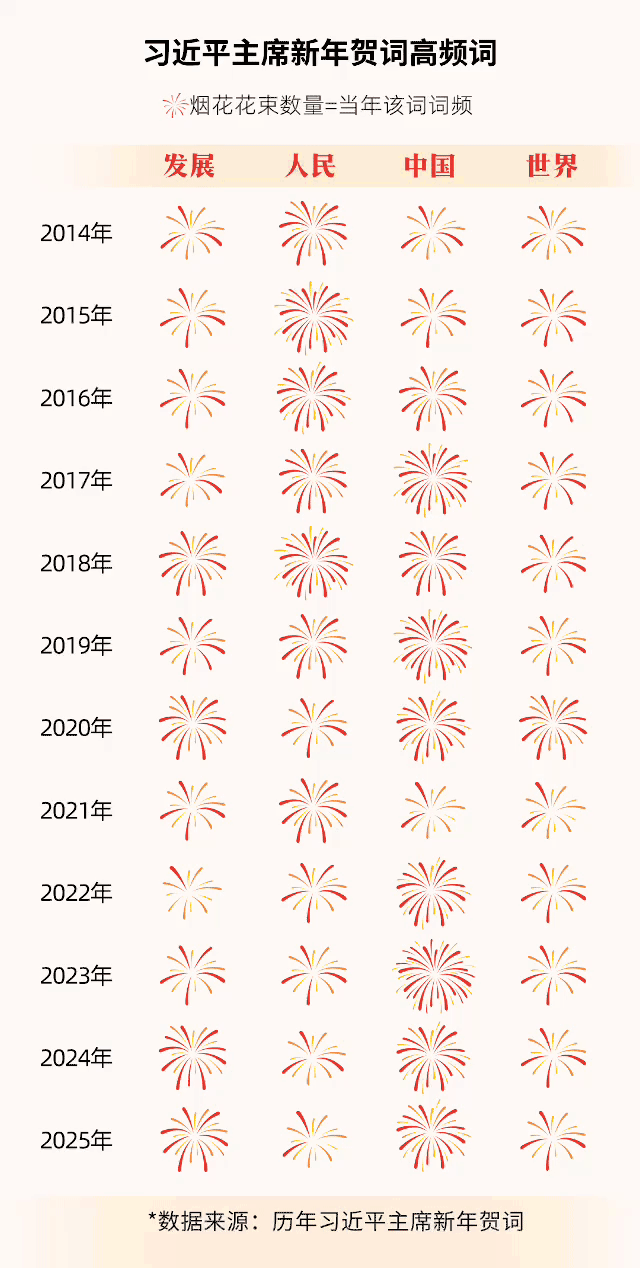 從高頻詞分析結果來看,“發展”“人民”“中國”“世界”是他每年新年賀詞都會強調的詞語。