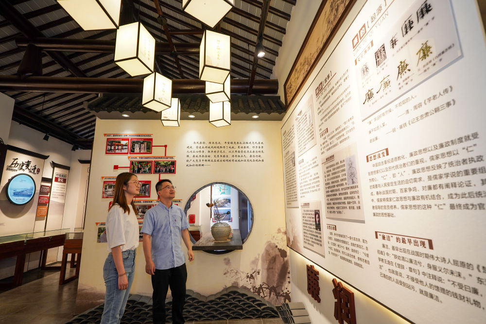 參觀者在蘇州市吳江區平望鎮廉潔教育基地鶯湖廉園內參觀(2024年7月4日攝)。