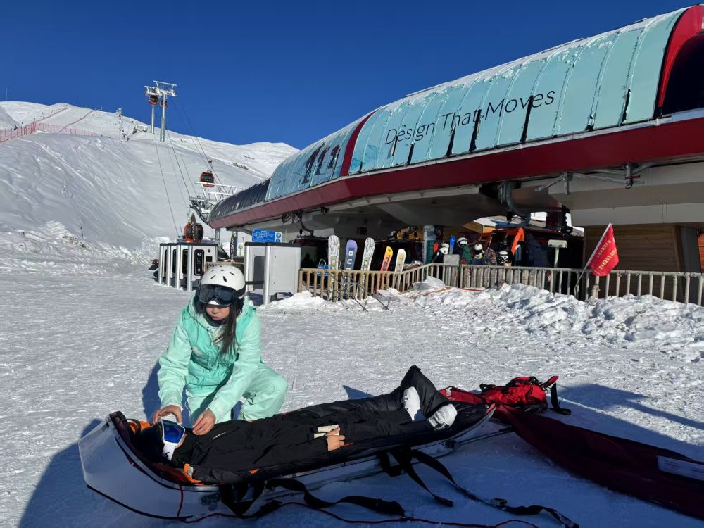 一次巡邏時,帕提曼看到一名雪友橫躺在雪道中間,雪板被甩出很遠,上前查看后發現其大腿骨折。她立即進行夾板固定、紗布包扎等操作,隨后協助轉運傷員。