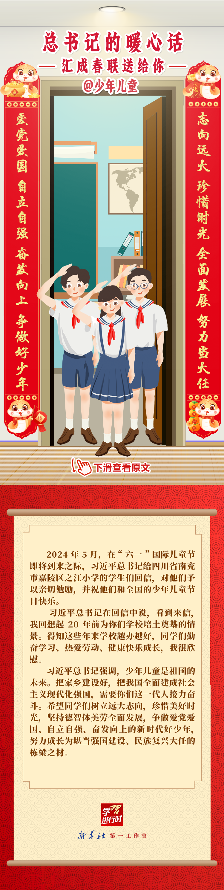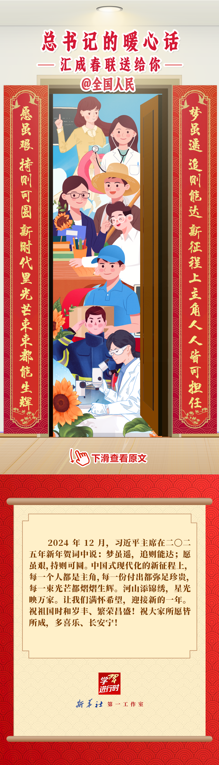 【學習進行時】過春節,貼春聯,寄托人們對新年的美好愿望。過去一年,習近平總書記在不同場合點贊各行各業奮斗者,說了許多暖心話。新春之際,我們匯編成聯,向新征程上的每一位“主角”致敬,送上新春的祝福。