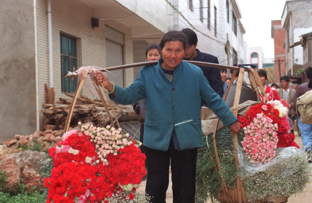 云南省昆明市呈貢龍街鄉(xiāng)斗南村是中國有名的“花鄉(xiāng)”,全村幾乎家家種花。這是一位當(dāng)?shù)鼗ㄞr(nóng)挑著一擔(dān)鮮花去花卉交易市場出售(1999年6月2日發(fā))。