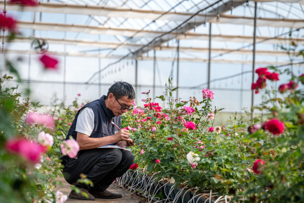 2023年10月20日,在云南省安寧市現(xiàn)代農(nóng)業(yè)園區(qū)玫瑰種植示范園,技術(shù)員田連通在記錄太空育種玫瑰花編號(hào)。