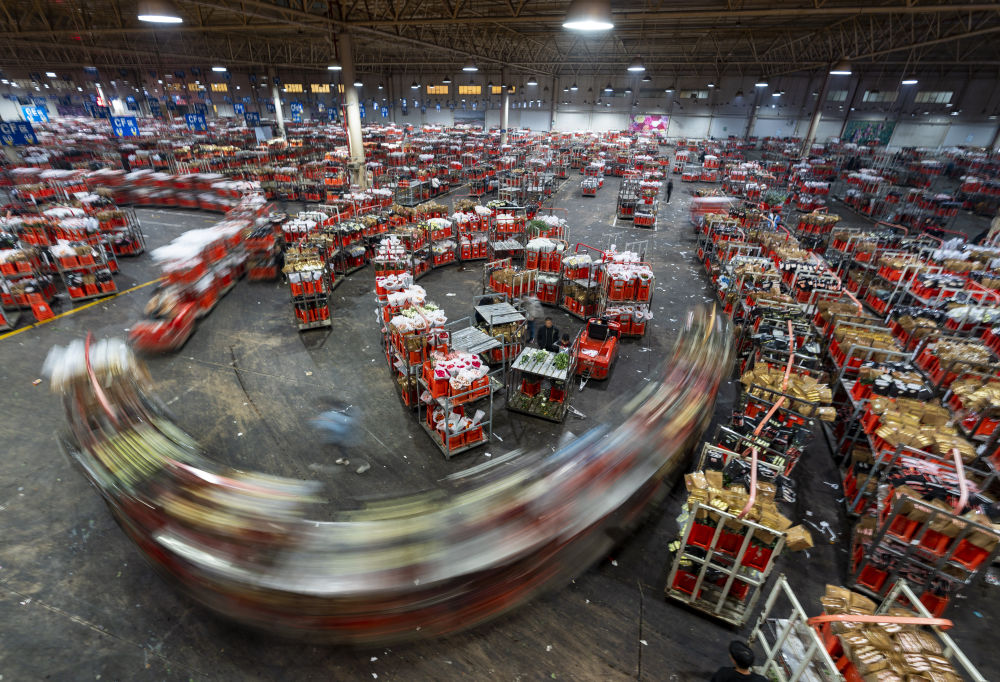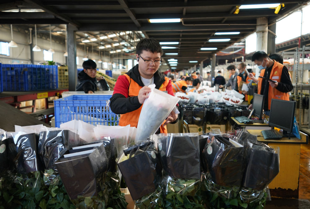 2022年11月11日,工作人員在昆明斗南花市給鮮花貼標(biāo)簽。快遞物流時(shí)效不斷優(yōu)化、冷鏈運(yùn)輸技術(shù)持續(xù)提升,也為中國鮮花加速“出海”保駕護(hù)航。