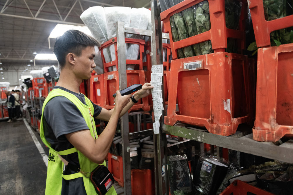 2023年7月13日,一名工作人員在昆明國際花卉拍賣交易中心內(nèi)對臺(tái)車上存放的鮮花掃碼。