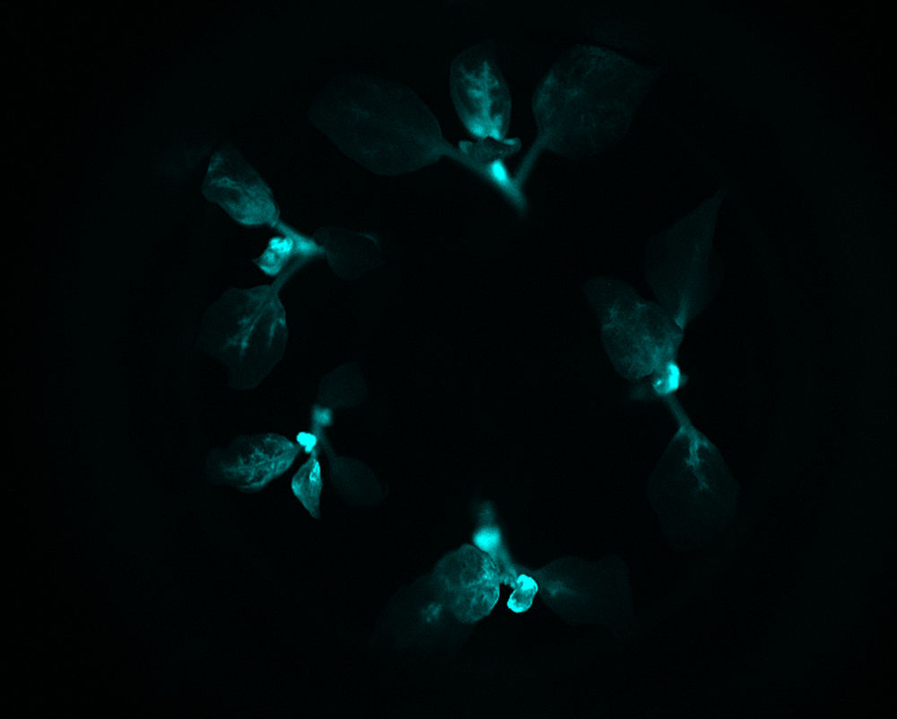 這是云南某農(nóng)業(yè)研發(fā)團(tuán)隊(duì)利用基因技術(shù)成功培育出肉眼可見的“自發(fā)光植物”在黑暗條件下發(fā)光(2017年6月21日攝)。