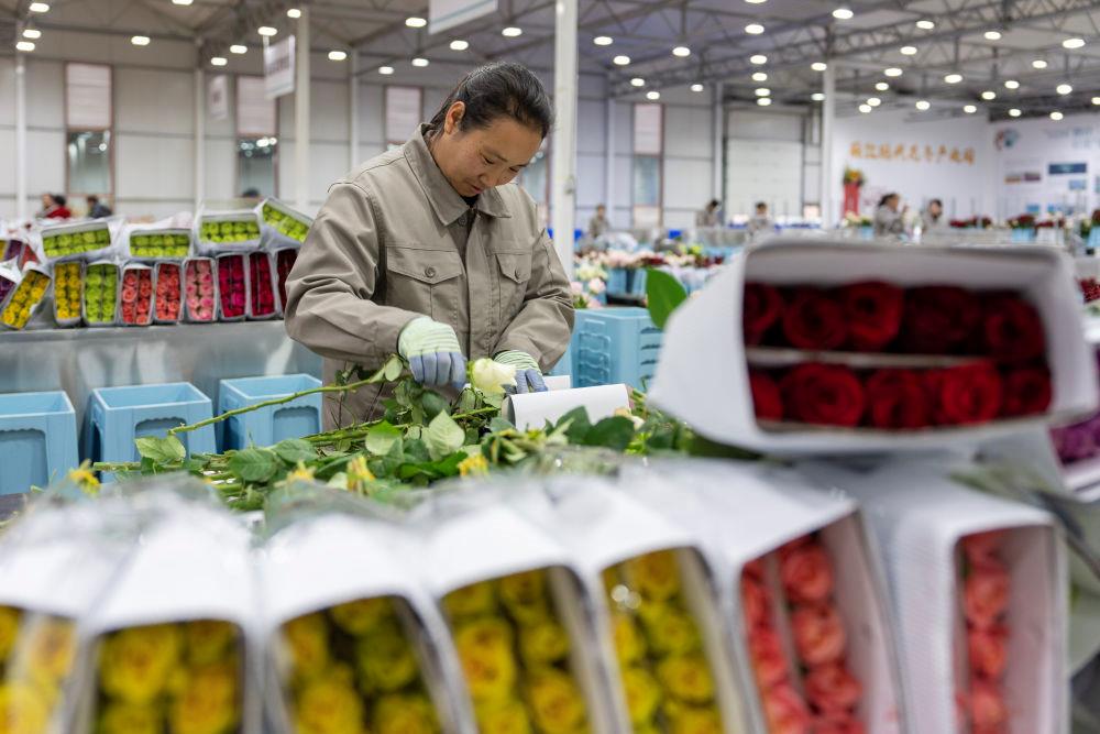 △近日,工作人員在云南麗江現代花卉產業園包裝鮮花。