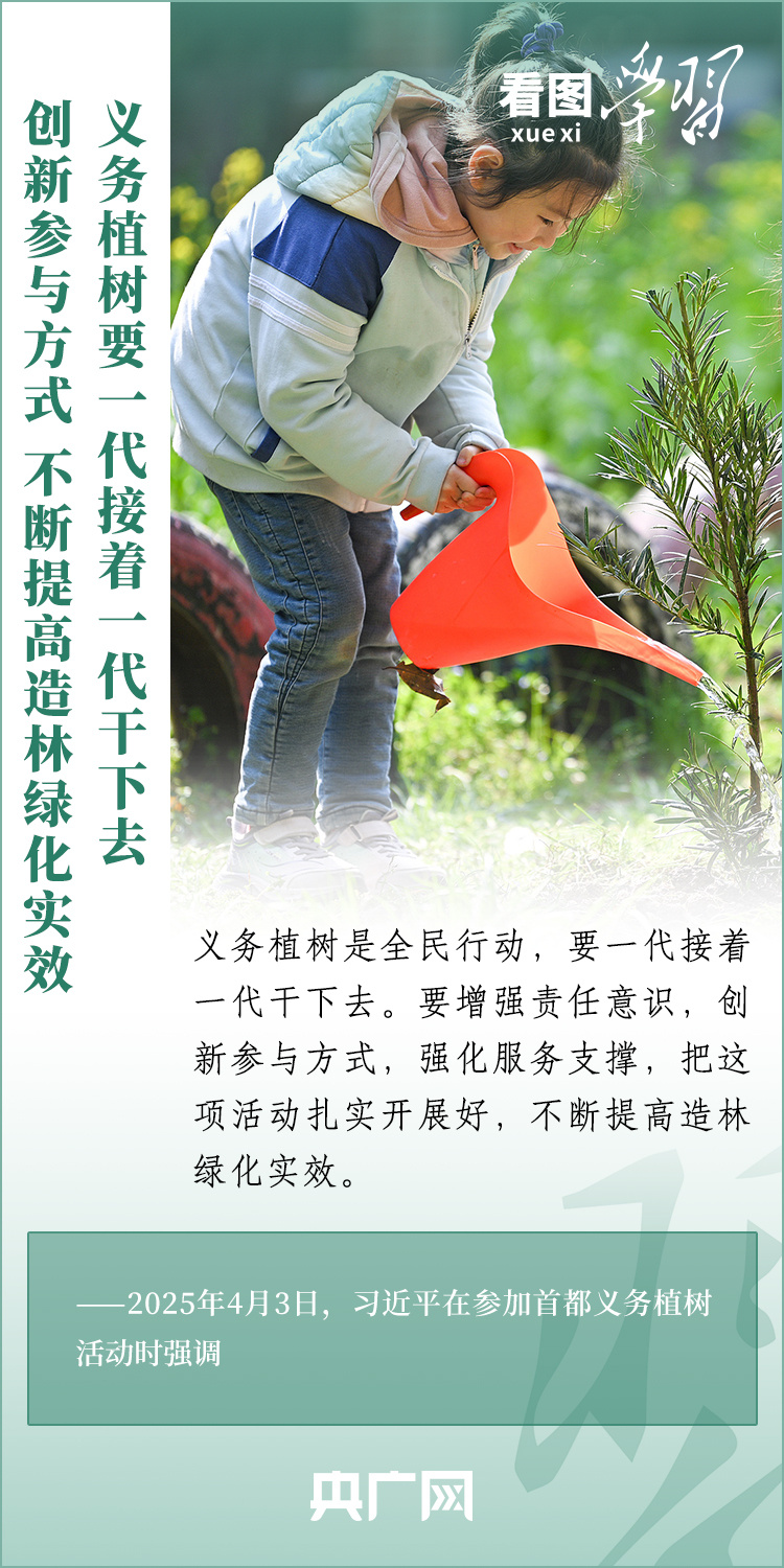 植樹造林是生態文明建設重要一環。4月3日,習近平總書記參加首都義務植樹活動。在植樹現場,總書記高度肯定國土綠化工作取得來之不易的成績,強調綠化祖國必須堅持“三綠”并舉、“四庫”聯動,要更加注重“提質”“興業”“利民”,“匯聚共建美麗中國的磅礴力量,讓祖國大地更加綠意盎然、生機勃發”。一起來學習!