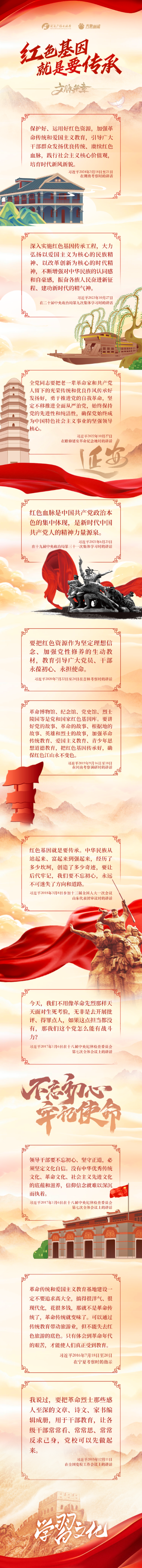 習近平總書記高度重視紅色基因傳承,發表了一系列重要講話,引導我們賡續紅色血脈,激發愛國熱情,振奮民族精神。我們一起學習。