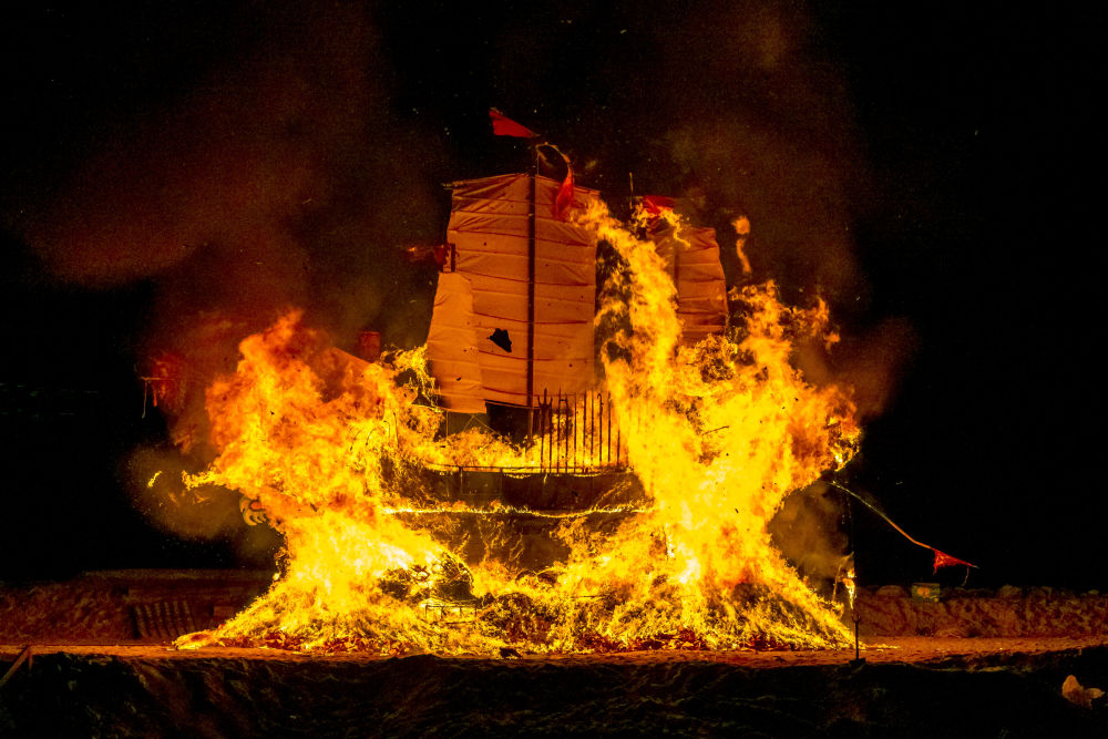 送王船是廣泛流傳于我國閩南地區和馬來西亞馬六甲沿海地區禳災祈安的民俗活動。2020年,中國與馬來西亞聯合申報的“送王船——有關人與海洋可持續聯系的儀式及相關實踐”項目,被列入聯合國教科文組織人類非物質文化遺產代表作名錄。這是2020年11月16日,在馬來西亞馬六甲,人們點燃“國安號”王船。