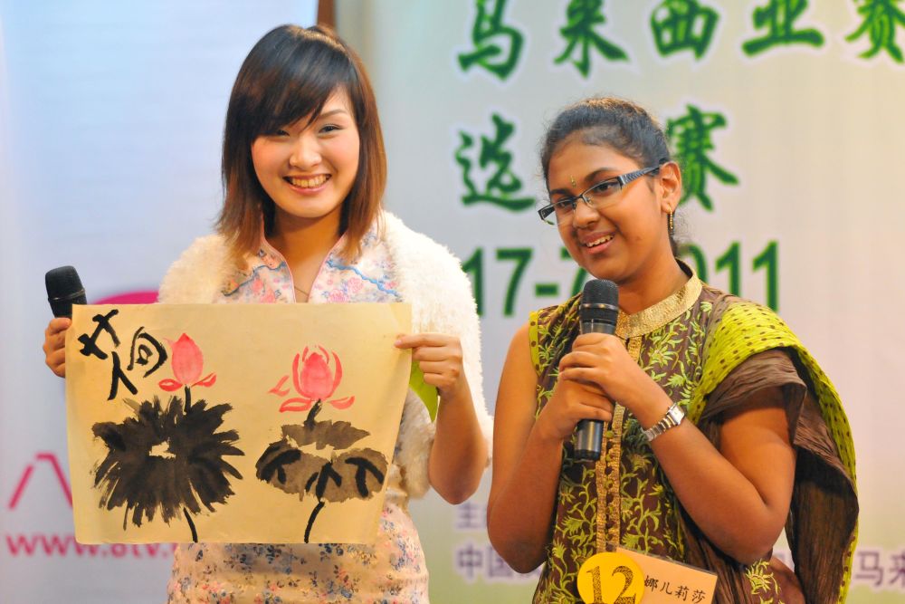 2011年7月17日,參加世界中學生中文比賽馬來西亞賽區比賽的選手馬雅司(左)展示自己創作的水墨畫。