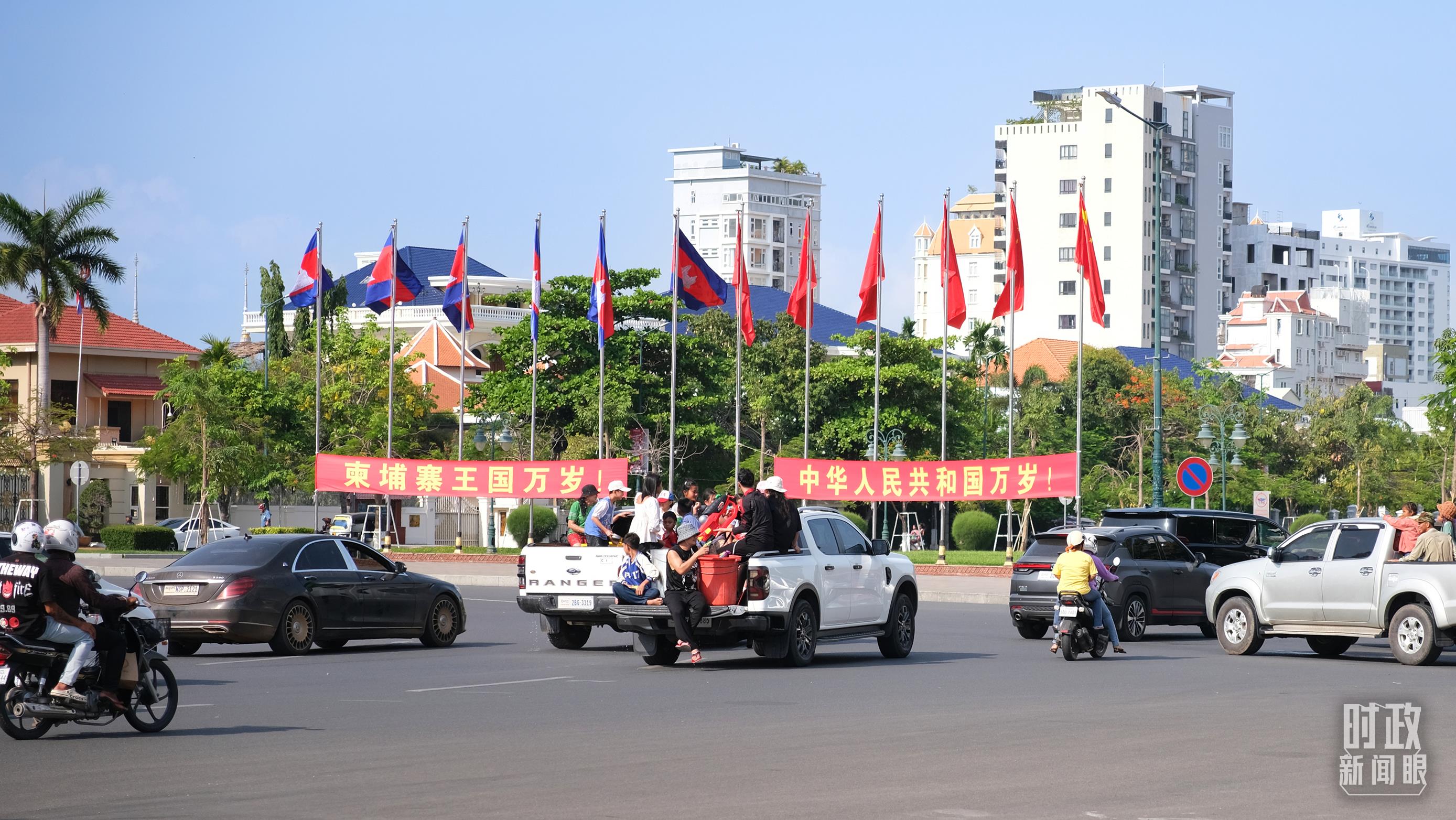 金邊街頭的巨幅兩國領導人照片和兩國國旗。(總臺央視記者陸泓宇拍攝)