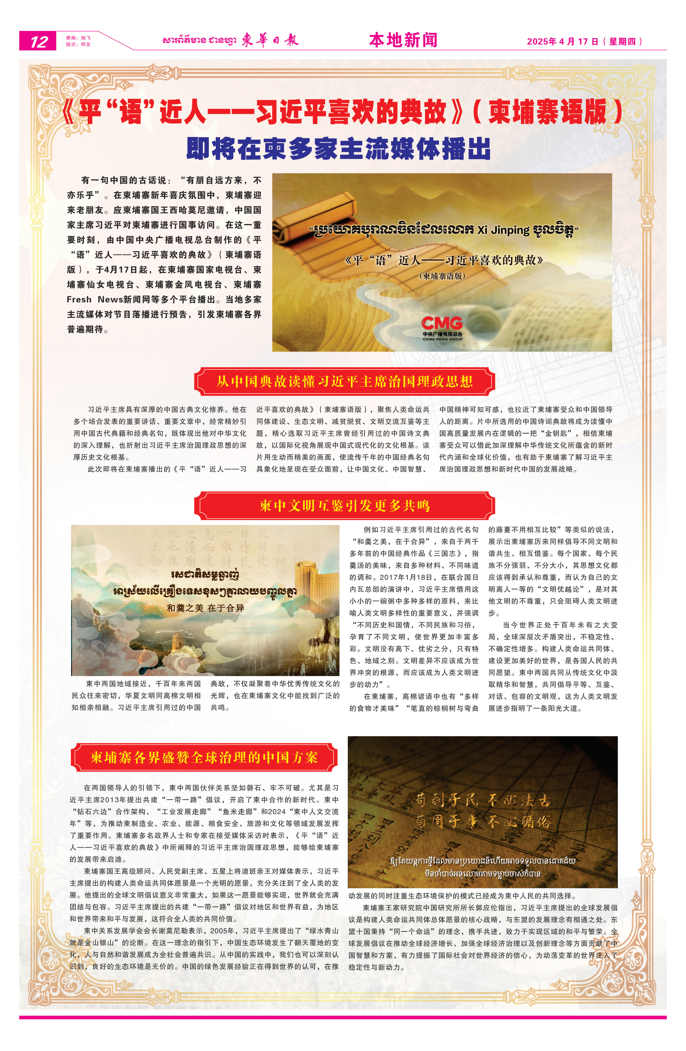 4月12日至17日,《柬華日報》《大都市報》等當地報紙刊發節目播出預告消息。文章指出,《平“語”近人——習近平喜歡的典故》(柬埔寨語版)是一把讀懂中國高質量發展內在邏輯的“金鑰匙”,相信柬埔寨受眾可以通過這些中國古籍和經典名句加深理解中華優秀傳統文化所蘊含的新時代內涵和全球化價值,了解習近平主席治國理政思想和新時代中國的發展戰略。