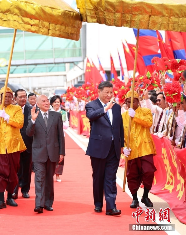 當地時間4月17日上午,中國國家主席習近平乘專機抵達金邊,應柬埔寨國王西哈莫尼邀請,對柬埔寨進行國事訪問。西哈莫尼在機場為習近平舉行隆重歡迎儀式。 中新社記者 盛佳鵬 攝