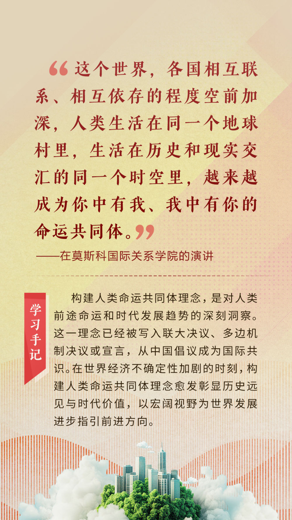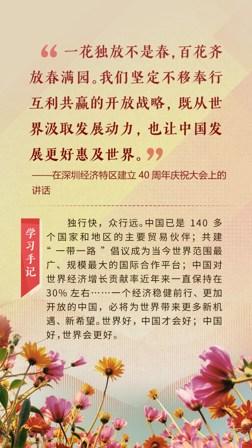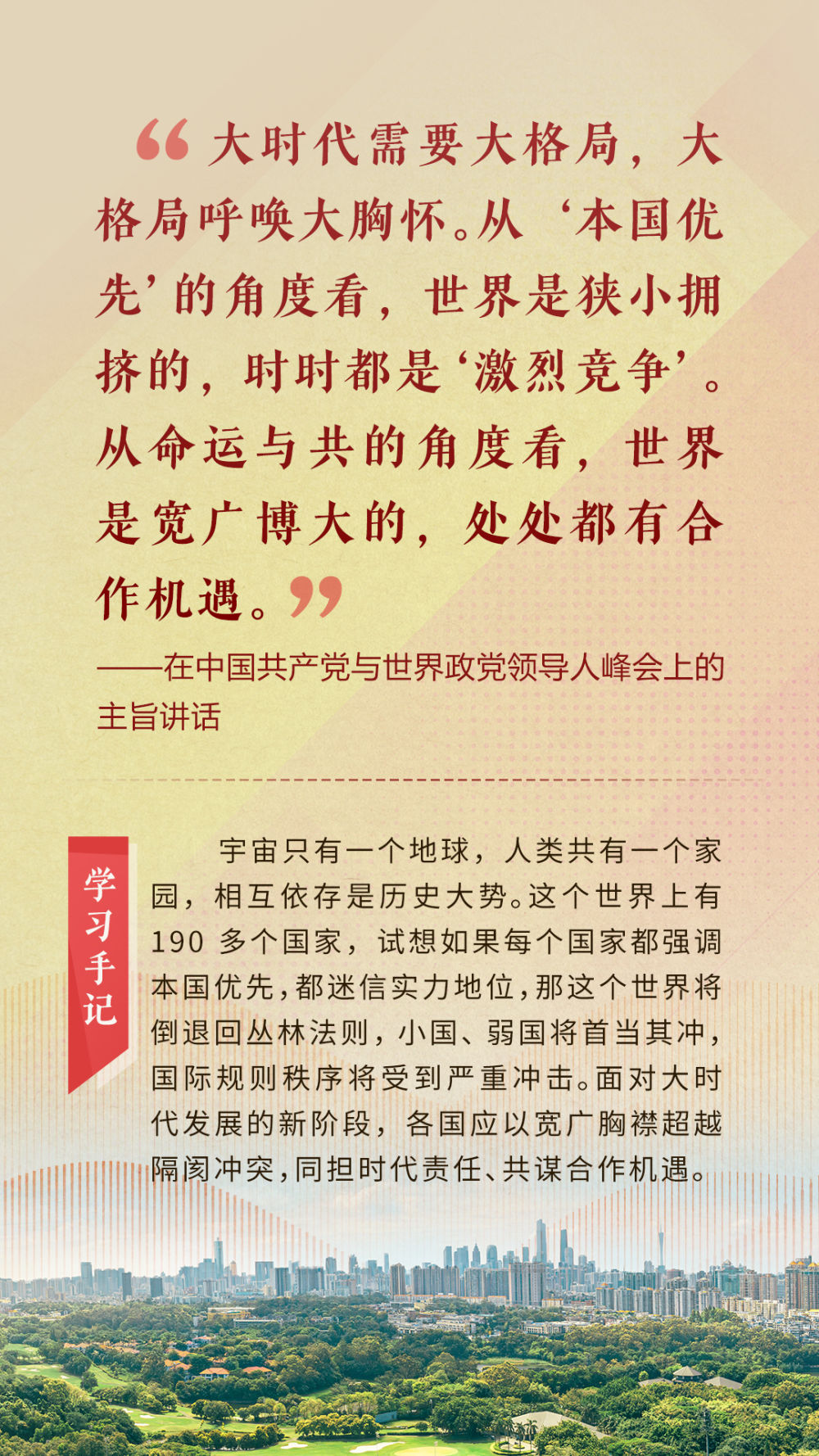 “天空足夠大,地球足夠大,世界也足夠大,容得下各國共同發展繁榮”“你中有我、我中有你的命運共同體”“與中國同行就是與機遇同行”……習近平總書記一次次在重要場合發表重要講話,指引我們站在歷史正確的一邊,站在人類進步的一邊,不畏浮云、登高望遠,不懼風浪、勇毅前行。