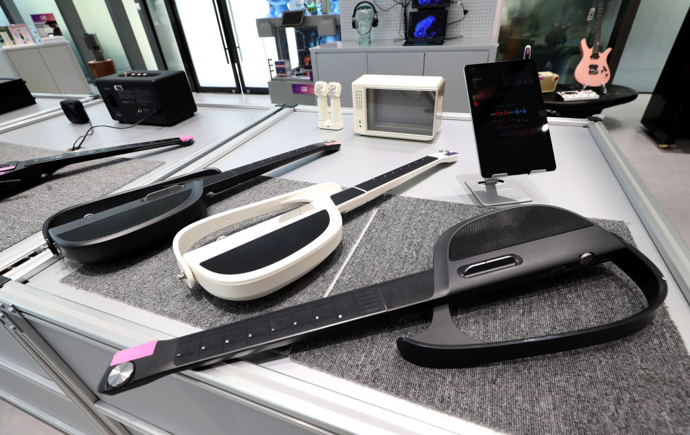 “模速空間”內的人工智能產品體驗店展出的智能吉他。新華社記者 方喆 攝