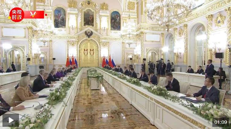 習近平強調,中國正在以中國式現代化全面推進強國建設、民族復興偉業。中方愿同俄方一道,承擔起時代賦予的特殊責任,維護全球多邊貿易體制和產業鏈供應鏈穩定暢通,為促進兩國發展振興、維護國際公平正義作出更大貢獻。