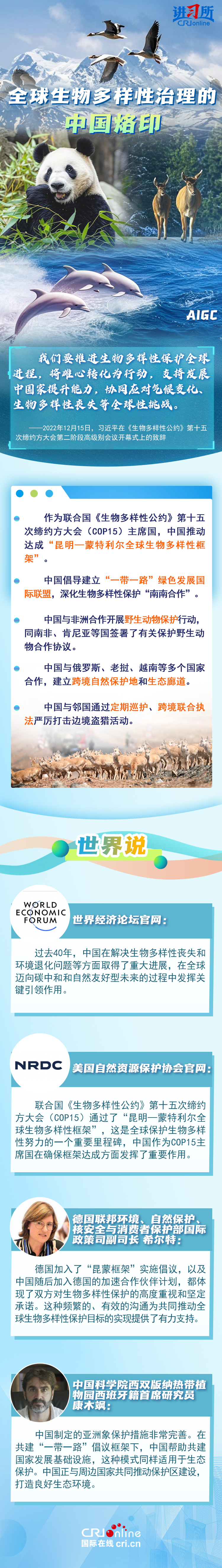 “心往一處想、勁往一處使,共建地球生命共同體?!弊鳛樽钤绾炇?、批準(zhǔn)《生物多樣性公約》的締約方之一,生物多樣性保護(hù)已經(jīng)上升為中國的國家發(fā)展戰(zhàn)略。國際人士表示,中國的一系列舉措體現(xiàn)出對生態(tài)環(huán)境保護(hù)的堅(jiān)定決心,同時(shí),中國依托共建“一帶一路”倡議等國際合作機(jī)制,為推動全球生物多樣性保護(hù)提供了有力支持,在邁向自然友好型未來的過程中發(fā)揮關(guān)鍵的引領(lǐng)作用。