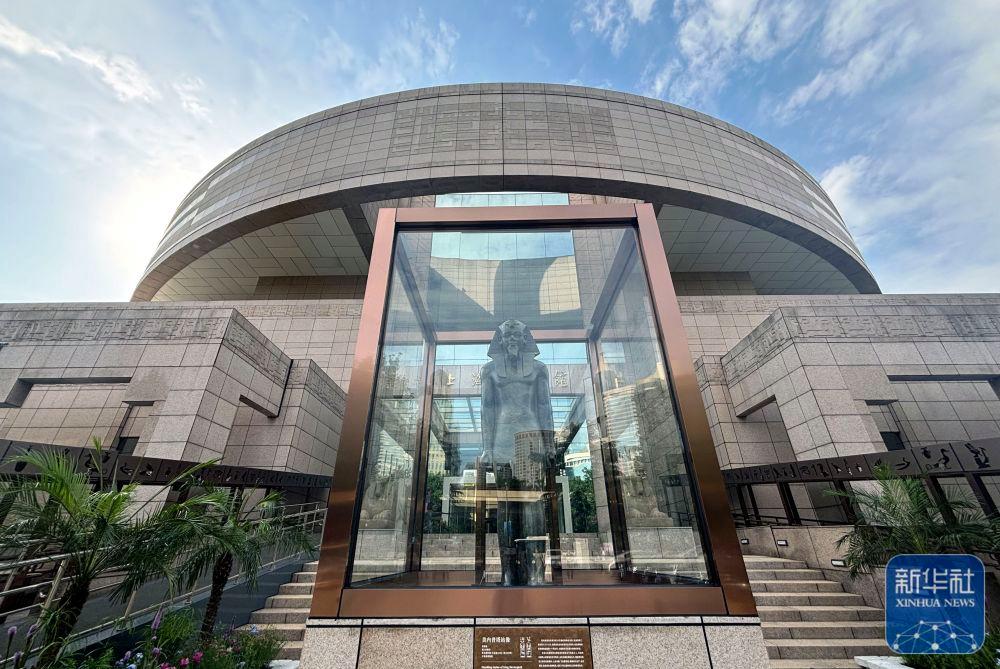 2024年7月17日在上海博物館人民廣場館南門拍攝的“金字塔之巔:古埃及文明大展”美內普塔站像,這是上海博物館首次把文物展品放在室外展出。該展是近20年來埃及在境外舉辦的最大規模文物展,其中95%以上的文物是首次來到亞洲,于2024年7月19日正式向公眾開放,將持續至2025年8月。