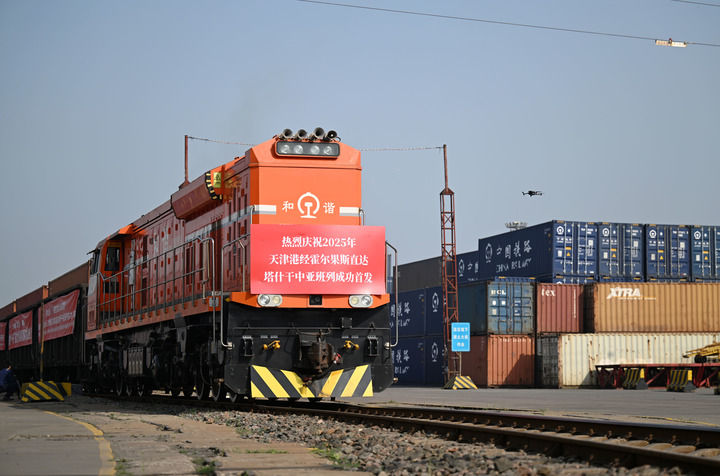 2025年5月20日,2025年首列天津港經霍爾果斯直達塔什干的中亞班列從天津港物捷三堆場發車。新華社記者 趙子碩 攝