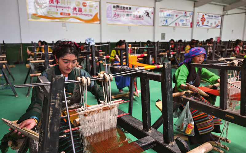 在西藏日喀則市仁布縣特色產業孵化園,亞德細褐羊毛織品農民專業合作社工作人員在車間里織布(2024年9月1日攝)孫瑞博攝/本刊