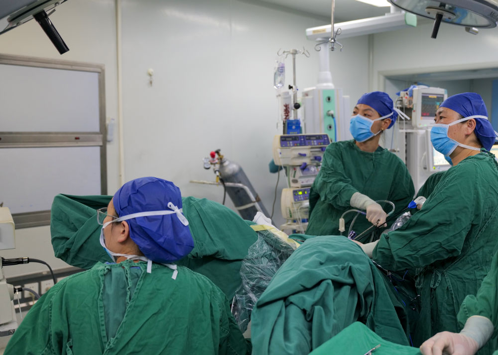 2025年8月4日,北京大學人民醫院第十批援藏婦科醫生張果(中)與西藏自治區人民醫院醫生李芳(左)一起為患者做手術。新華社發(柑丹鴦琦 攝)