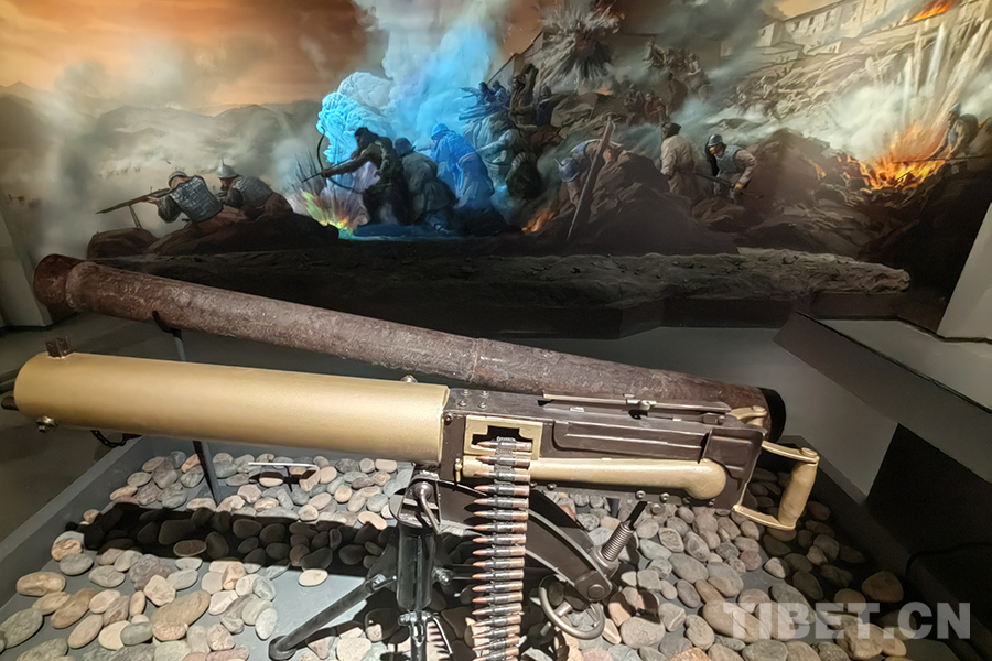 圖為宗山號(hào)角——紀(jì)念西藏江孜抗英保衛(wèi)戰(zhàn)120周年主題展現(xiàn)場(chǎng),英軍當(dāng)時(shí)使用的馬克沁機(jī)槍模型(前),藏軍使用的土炮(后),背景為相關(guān)歷史場(chǎng)景的視覺還原。馬克沁機(jī)槍是全自動(dòng)機(jī)槍,也是當(dāng)時(shí)殺傷力較大的武器,理論射速達(dá)600發(fā)/分鐘 攝影:楊月云