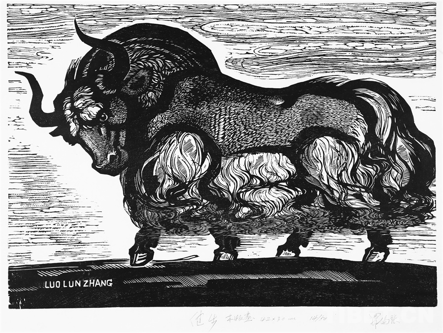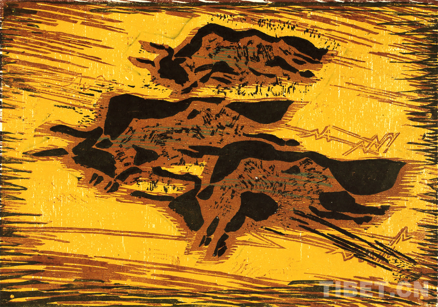 如果非要說我在版畫技法上有什么創新,參照西藏匠人刻經文,在石頭上刻出來然后印出來也許就算。這不是一般石版畫概念,那叫石印,平版印刷;我這是凹版印刷。刻起來很費勁,我也不管費不費勁。我有一批這樣的石刻作品。綜合版作品手法較多,我通常分別在石板和木板上刻,然后套起來印。如果搞學術交流,也許值得一談。至于說到創新,第一我不認為我有什么創新,第二我不認為在藝術上、在美術上能夠輕易談創新這個詞。還有第三個觀點:不需要創新。很簡單,你先把傳統學到手再說。既是傳統,就有它的存在理由,否則早就夭折了,還傳什么統呢?傳,而且統啊!統是什么意思?基調是它統一起來的。先把傳統學到手,爐火純青了,神來之筆出現了,才有可能有所創造。基礎是重要的。