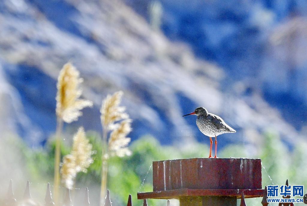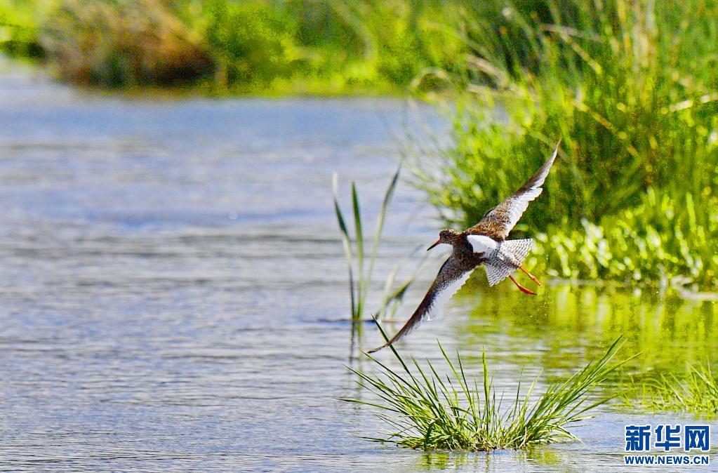 棲息在拉魯濕地核心區里的紅腳鷸(6月2日攝)。新華社記者 張汝鋒 攝