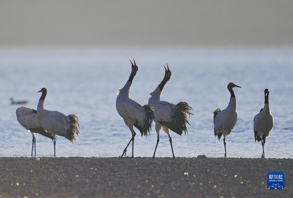 這是在林周縣虎頭山水庫拍攝的黑頸鶴(12月7日攝)。新華社記者 張汝鋒 攝