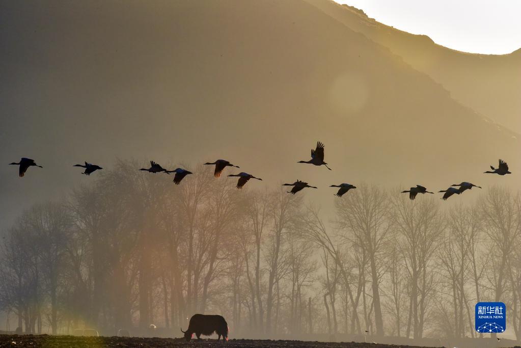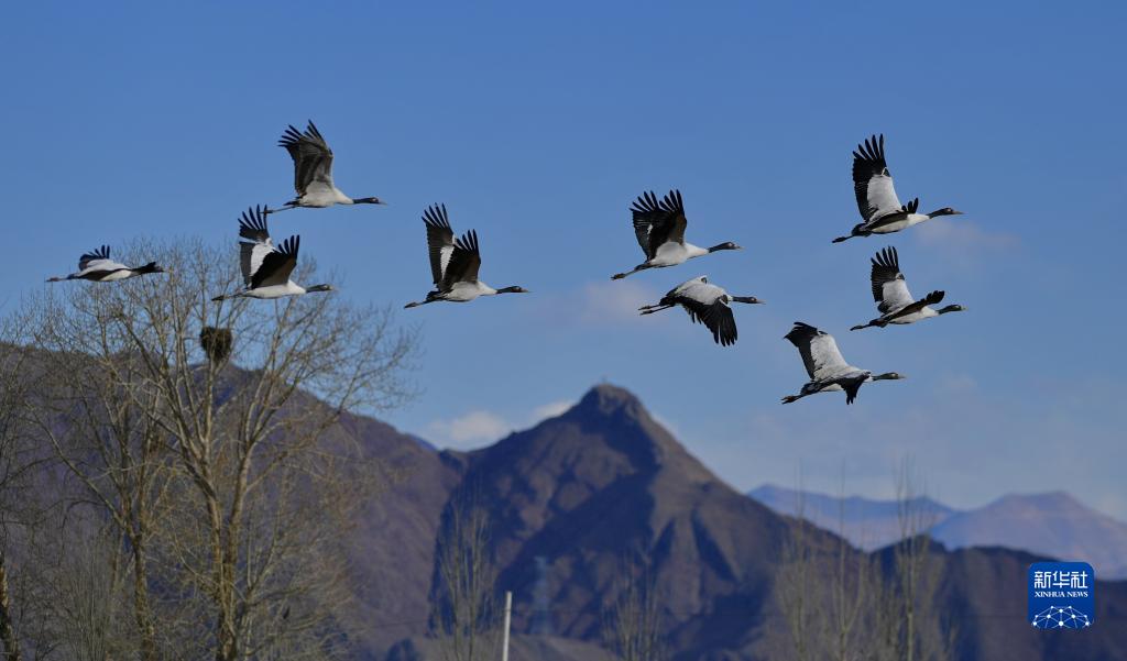 黑頸鶴在拉薩市林周縣黑頸鶴自然保護區飛翔(1月8日攝)。新華社記者 張汝鋒 攝