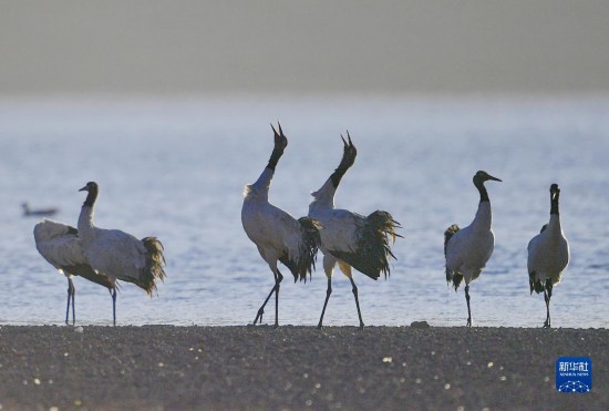 黑頸鶴在拉薩市林周縣農田里起舞(1月8日攝)。新華社記者 張汝鋒 攝