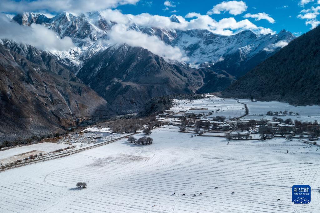 西藏林芝市米林縣派鎮雪景(1月14日攝,無人機照片)。新華社發(董志雄 攝)